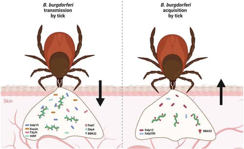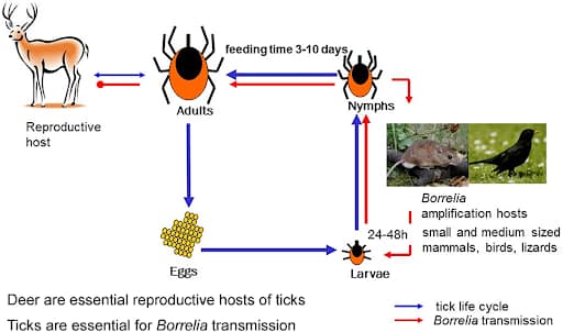 - When the tick bites and draws blood from the host, it picks up the Borrelia burgdorferi bacteria and stores it in its guts.