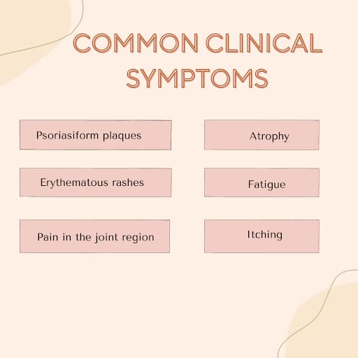 Psoriasis is an autoimmune condition which is characterized by inflamed regions. When the skin cells proliferate quickly, it will shed every 3 to 4 days. (1) The clinical symptoms involves: