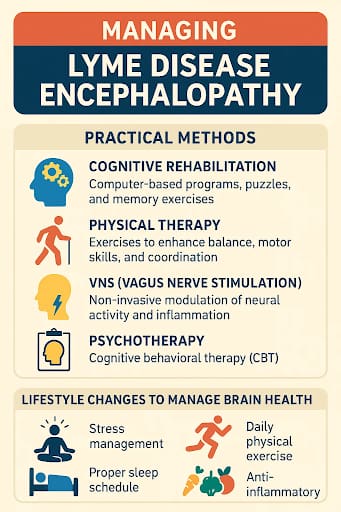 - Physical Therapy – Tailored exercises to enhance balance, motor skills, and coordination to aim physical impairments caused by Lyme disease encephalopathy.