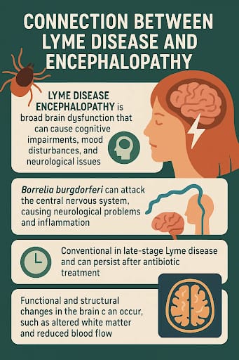- Lyme disease encephalopathy caused by Lyme disease that impacts cognitive function, resulting in memory loss or disturbance, brain fog, and emotional challenges.